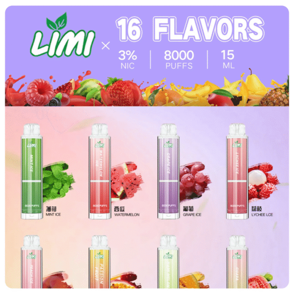 LIMI 8000口一次性電子煙提供超大容量,適合重度使用者。內置 550mAh 電池與 15ML 煙油,提供長達 8000口 的使用體驗。可充電,使用完畢即可拋棄。