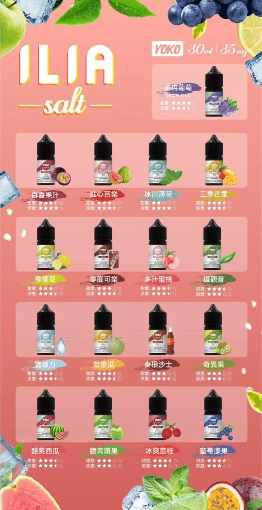 ILIA 哩亞 YOKO 小煙油系列,17 款果飲風味,35mg 尼古丁濃度,提供清新醇厚雙重享受,台灣現貨熱銷中!