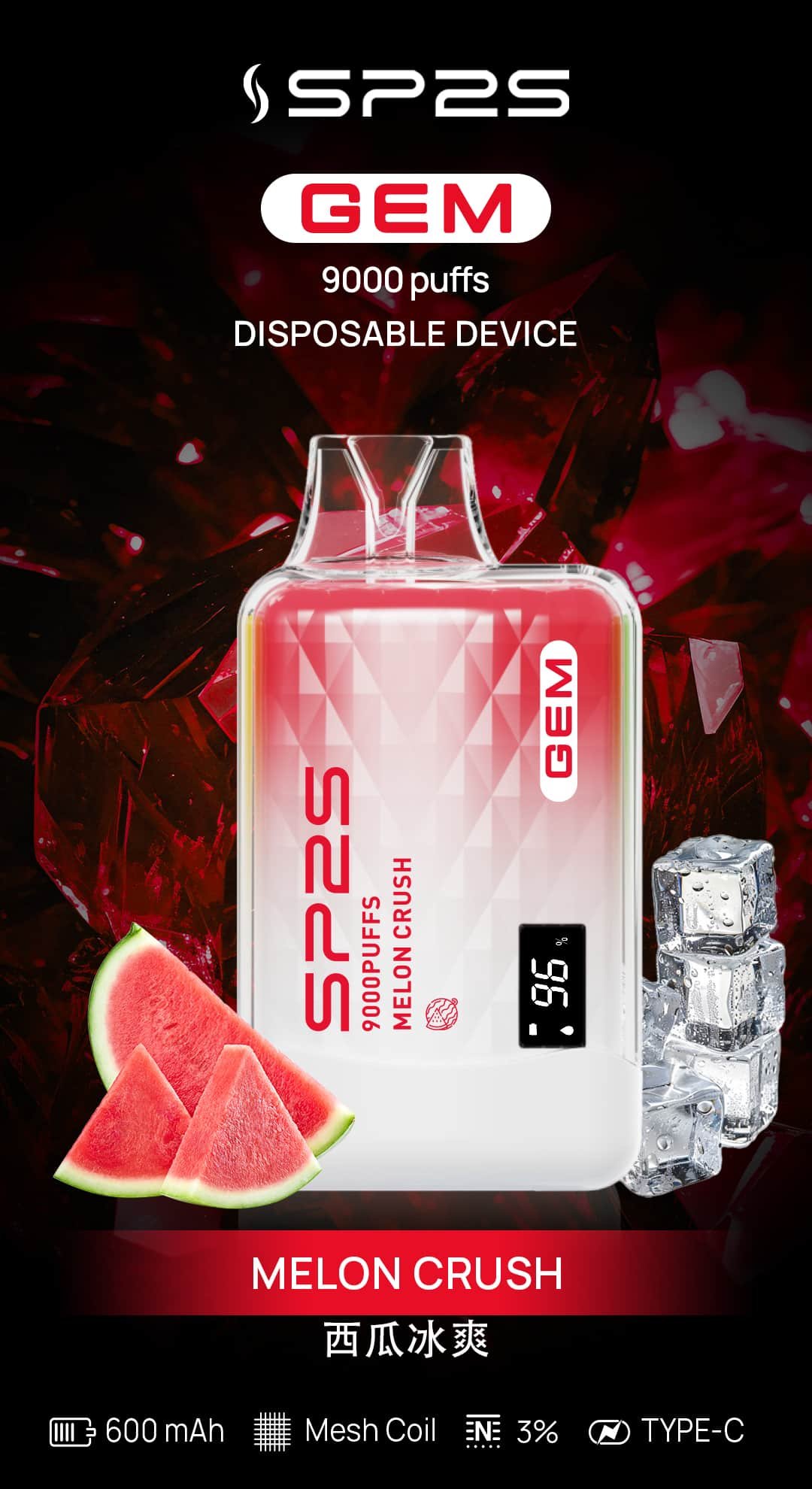 SP2S GEM 9000口拋棄式電子煙以智能顯示與奢華水晶設計,結合Mesh Coil技術與10種口味,打造極致吸煙體驗